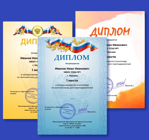 - Олимпиады по русскому языку для 1 класса- Олимпиады по русскому языку для 2 класса- Олимпиады по русскому языку для 3 класса- Олимпиады по русскому языку для 4 класса- Олимпиады по русскому языку для 5 класса- Олимпиады по русскому языку для 6 класса- Олимпиады по русскому языку для 7 класса- Олимпиады по русскому языку для 8 класса- Олимпиады по русскому языку для 9,10,11класса- Олимпиады по русскому языку для студентовПосле прохождения онлайн олимпиады вы сможете заказать именной диплом с оплатой на сайте. |